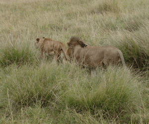 We finished lunch and decided to go back to the tall grass and look again for the lion. K’taw entered the grass as we did before and slowly maneuvered the Land Cruiser in ever decreasing circles. Then we saw them. The grass hid them so well that we almost drove over them. It was a large male and a large female and they were lying on their sides in the grass. I was sitting on top of the Land Cruiser, with my feet dangling inside the vehicle, and K’taw stopped and we were about five feet from the big black manned male. Something startled the male and he jumped to his feet and moved closer to us and K’taw started the engine and I said no, no don’t move. The male and I locked eyes and we both stood very still. “He’s magnificent,” Nell said. At first I thought I couldn’t move because of fear. But I then realized it wasn’t fear that froze me, but that I was mesmerized. I felt my arms raise my camera and trip the shutter again and again and again. And he still stood there and I still stood there and there was no sound but I could smell his acrid sweet breath, and noticed little pieces of grass clinging from the strands of his mane. The female got up and walked away from our vehicle – maybe about thirty feet – and the male broke eye contact with me and followed her. When he caught up with her he gently took the back of her neck in his large mouth and mounted her. They remained coupled for a half-minute and then he let her go and she turned over on her back and rolled and undulated in the grass. “Wasn’t that sweet?” Nell said. K’taw looked at her and said big males like that have been known to mate fifty times a day. Fifty times a day! I said. That’s pretty impressive by anyone’s standards.