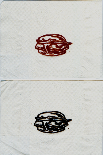 Hamburger. 6” x 5”. Woodcut on Napkin. 2003.